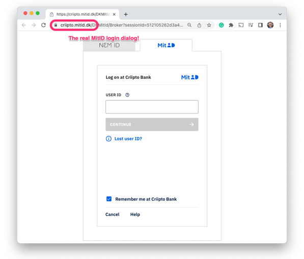 - When you enter your credentials, always make sure you are doing so on a mitid.dk subdomain. This is because MitID cannot run on any other domain.